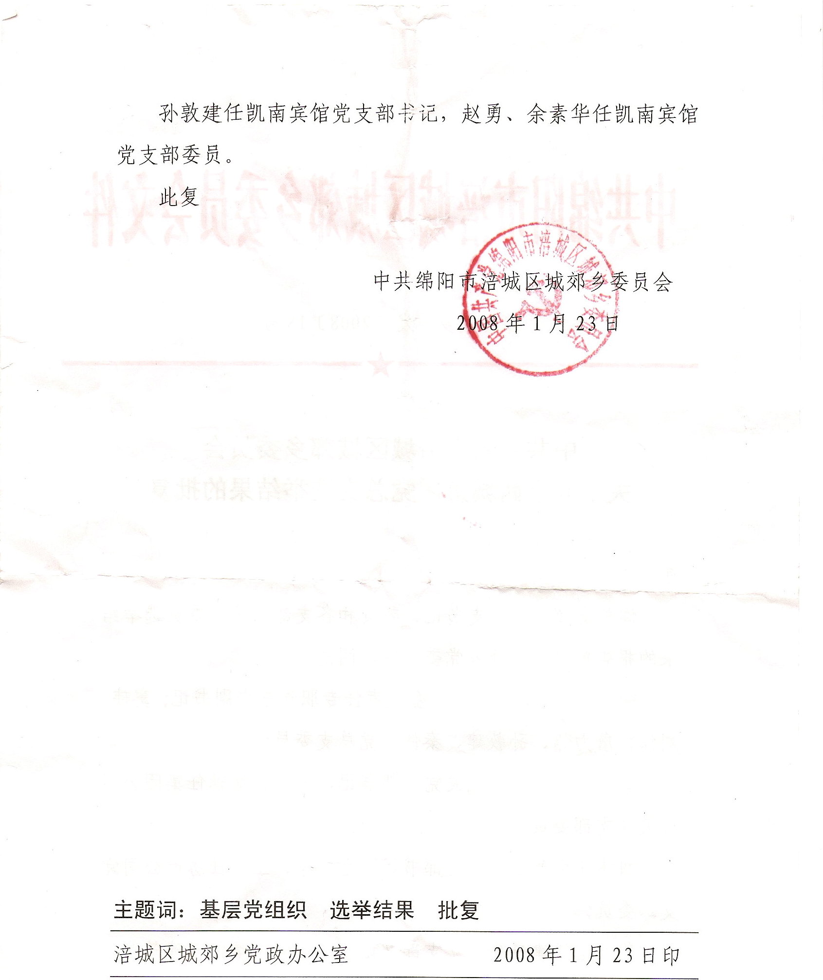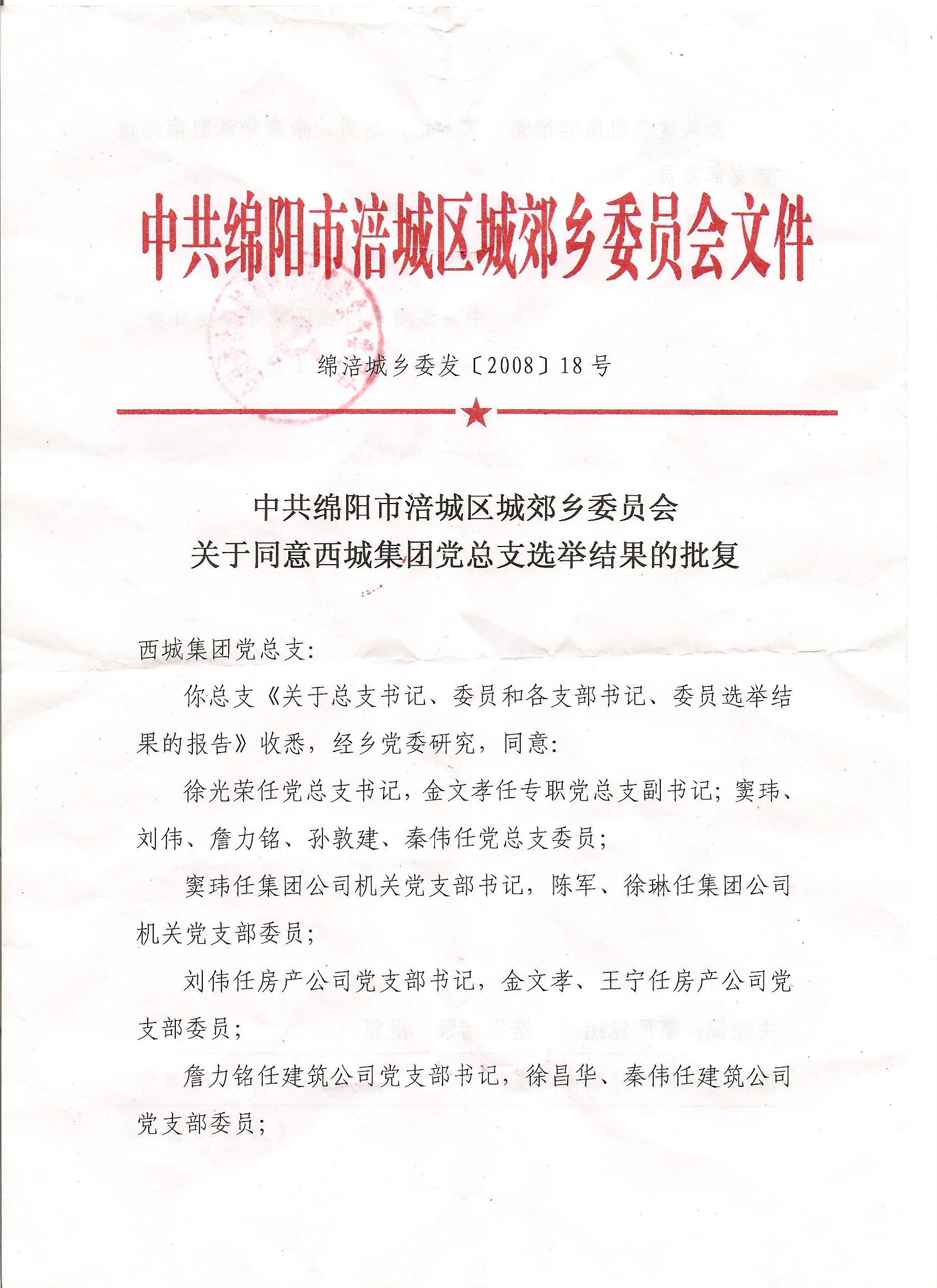中共绵阳市涪城区城郊乡委员会关于同意西城集团党总支选举结果的批复