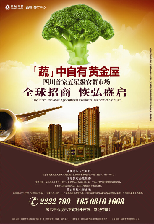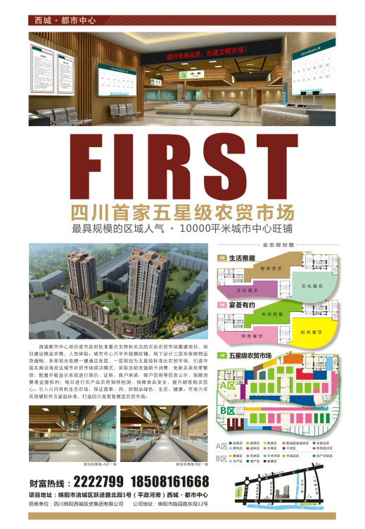 西城都市中心项目是市政府批准重点支持和关注的灾后农贸市场重建项目,项目建设精益求精,人性体贴,城市中心万平米规模旺铺,地下设计三层车库购物运货通畅,多部观光电梯一键通达各层,一层规划为五星级标准化农贸市场,引进中国东南沿海发达城市农贸市场成功模式,采取自助充值刷卡消费,免除买卖找零繁琐;配置平板显示系统进行菜价、证照、商户承诺、商户信用等信息公示,保障消费者监督权利;每日进行农产品农药抽样检测,保障食品安全,提升顾客购买信心。引入川内有机生态农场,保证蔬果、肉、奶制品绿色、生态、健康。市场力求实现硬件五星级标准,打造四川首家智慧型农贸市场。