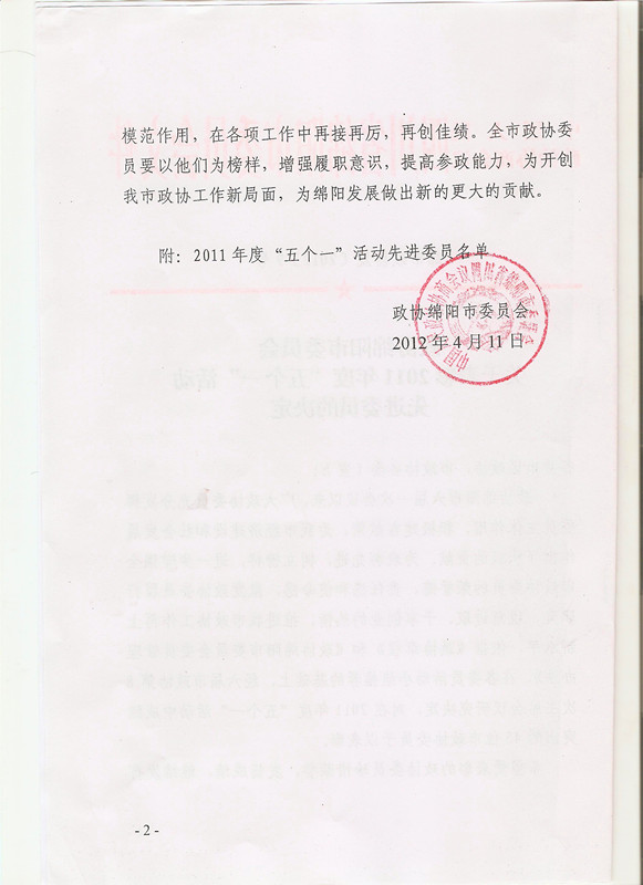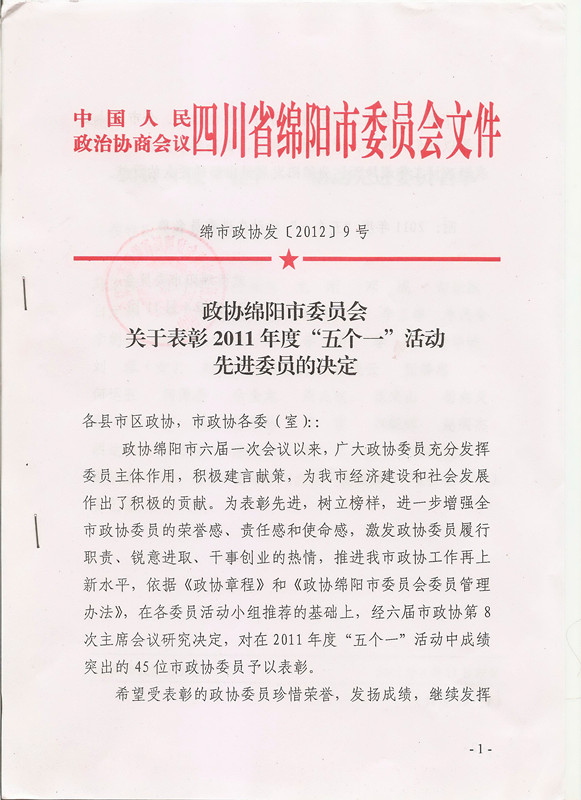 热烈祝贺集团董事长获绵阳市政协先进委员表彰