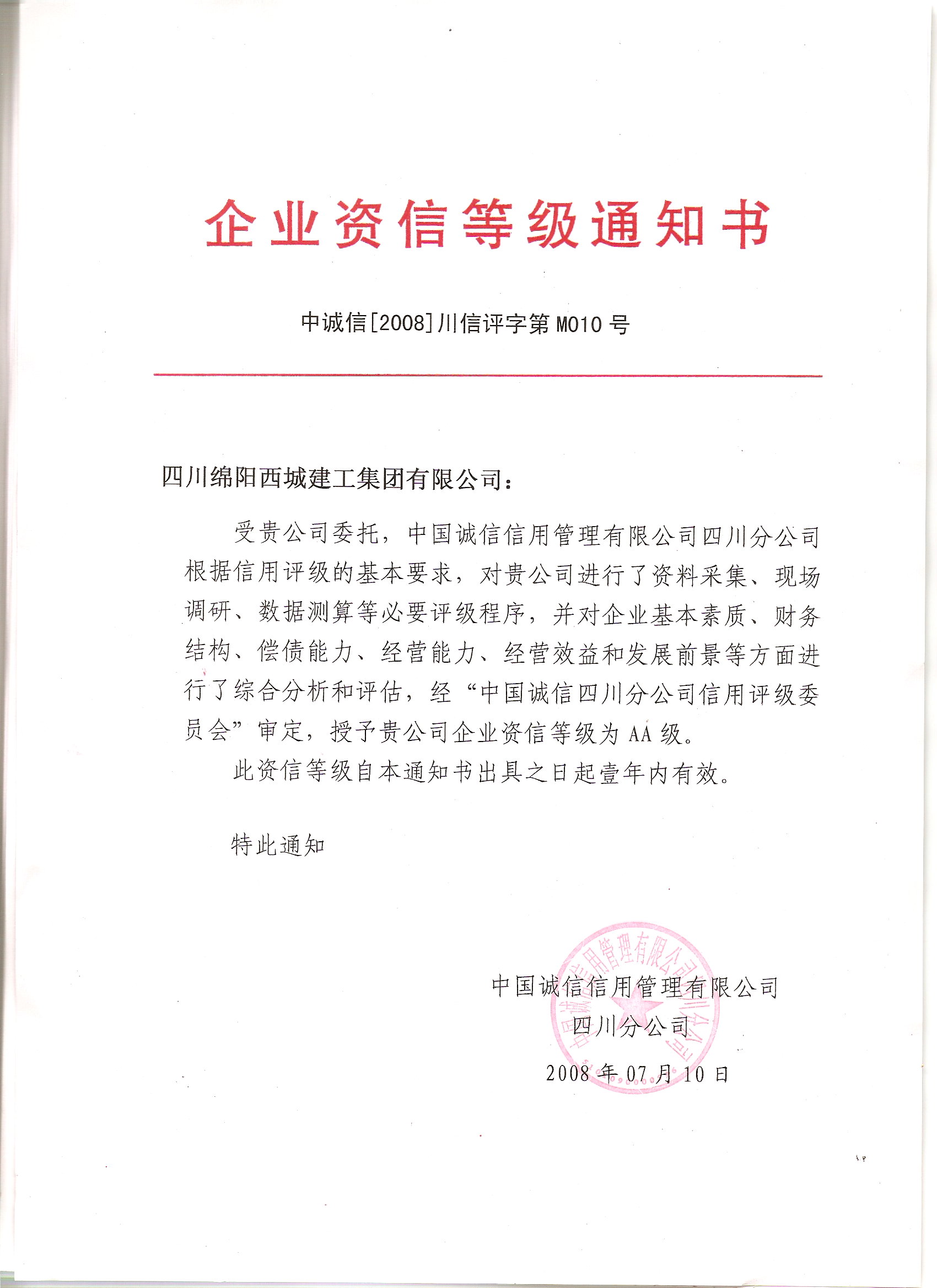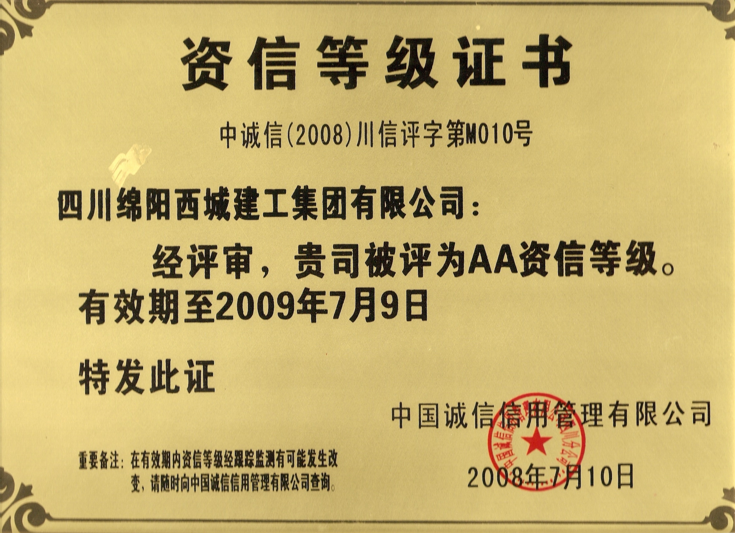 热烈祝贺四川绵阳西城建工集团有限公司被中国诚信信用管理有限公司授予企业资信等级“AA级”。