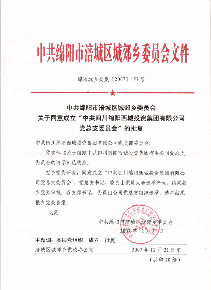 中共绵阳市涪城区城郊乡委员会关于同意成立“中共四川绵阳西城投资集团有限公司党总支委员会”的批复